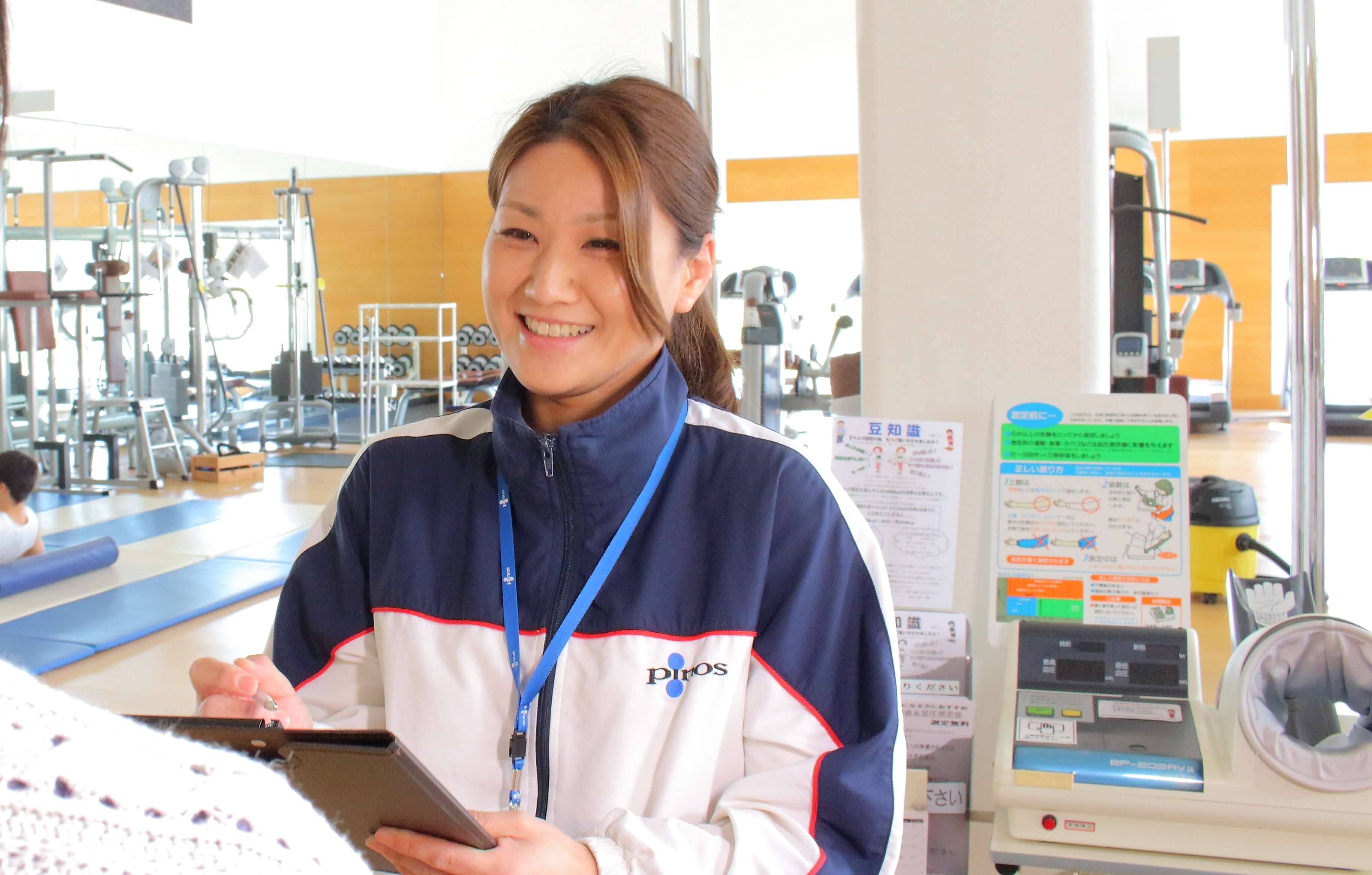 私はご入会すぐに館内の使い方やぴったりのメニューをご提案する「ウェルカムピノス」を担当させていただいております。お客様のほとんどが初めてフィットネスクラブに通われる方で、よーくお話を聞いてみると様々な不安をお持ちです。当たり前ですよね。そんな悩みの一つ一つに応えられるように、勉強しながらお客様と一緒に考えるのが好きです。先日も「ピノスに通うのが楽しい」とメッセージを頂いたのが嬉しかったです。初めてのフィットネスクラブ通いをサポートします。