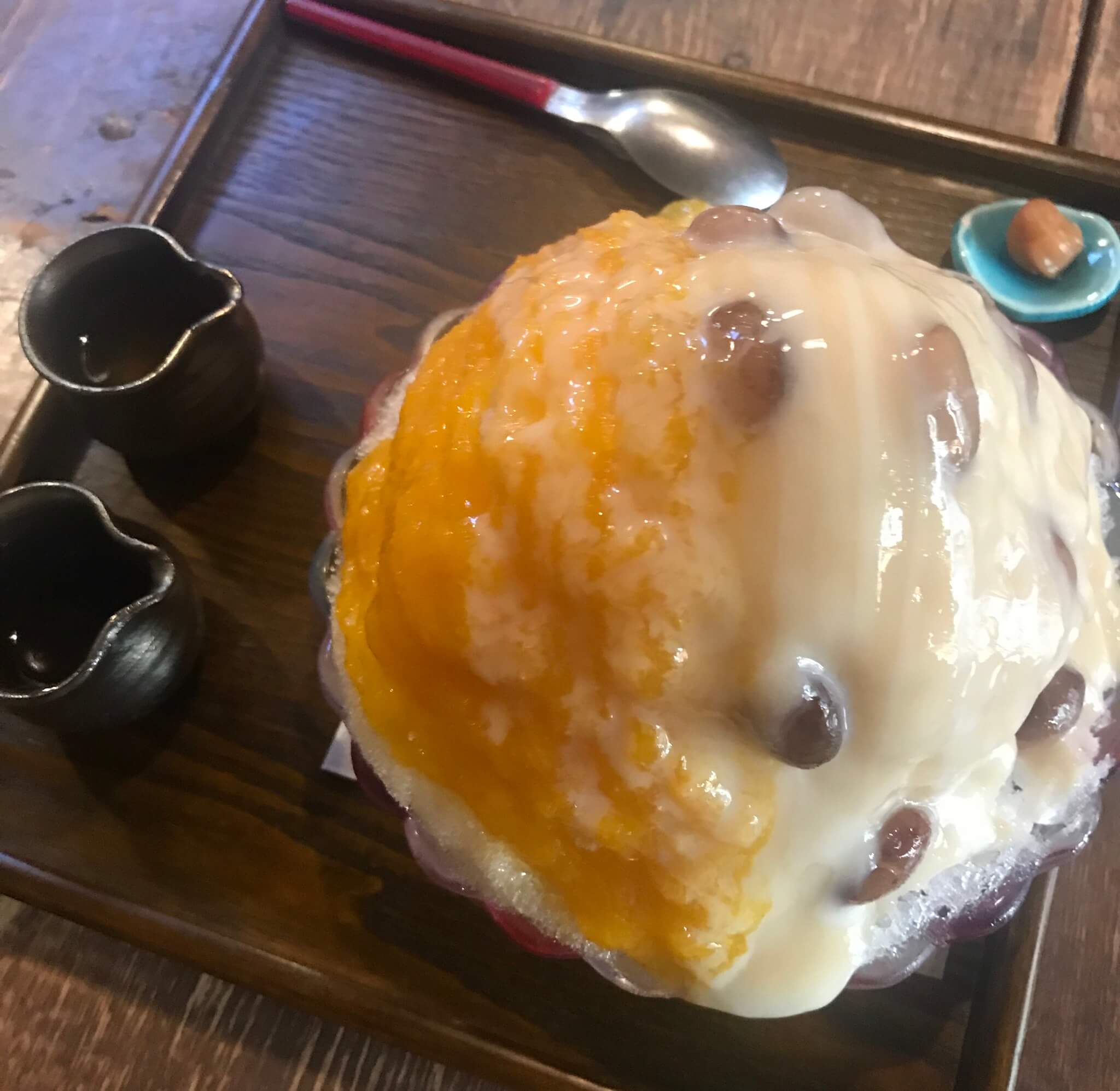京都の烏丸に行った時、あまりにも暑すぎて食べました(^O^)半分はオレンジで半分は甘酒のような甘い蜜と豆のかき氷です!ちょっと大人の味のかき氷でした(笑)