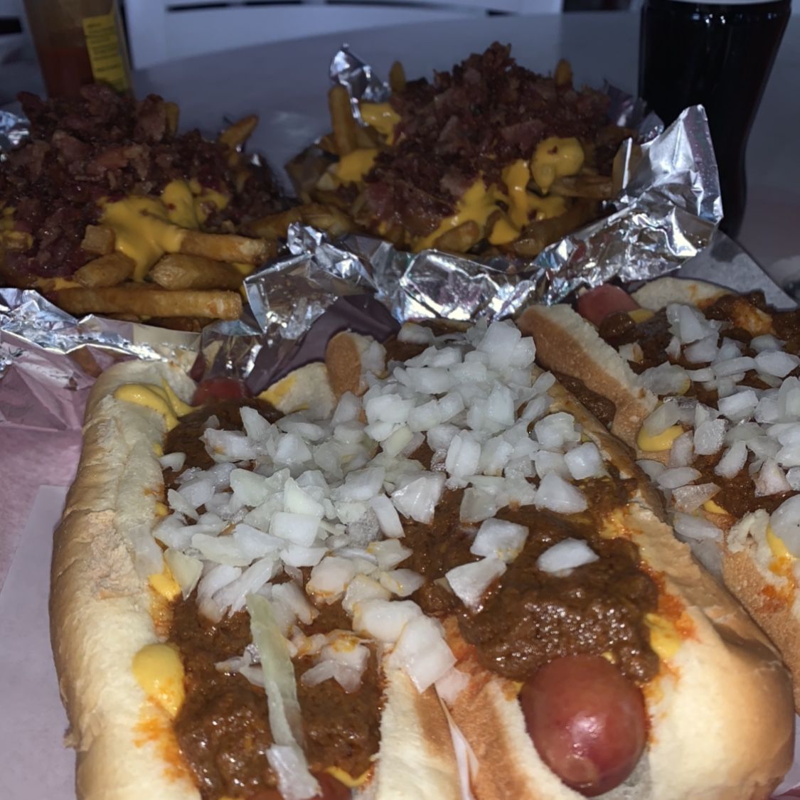 下は人気のホットドックで、2時間ほど並んで食べました~美味しいけどご覧の通りジャンキーすぎてしんどかったです(笑)奥のポテトもチーズとベーコンがのっていてハイカロリーでした(笑)